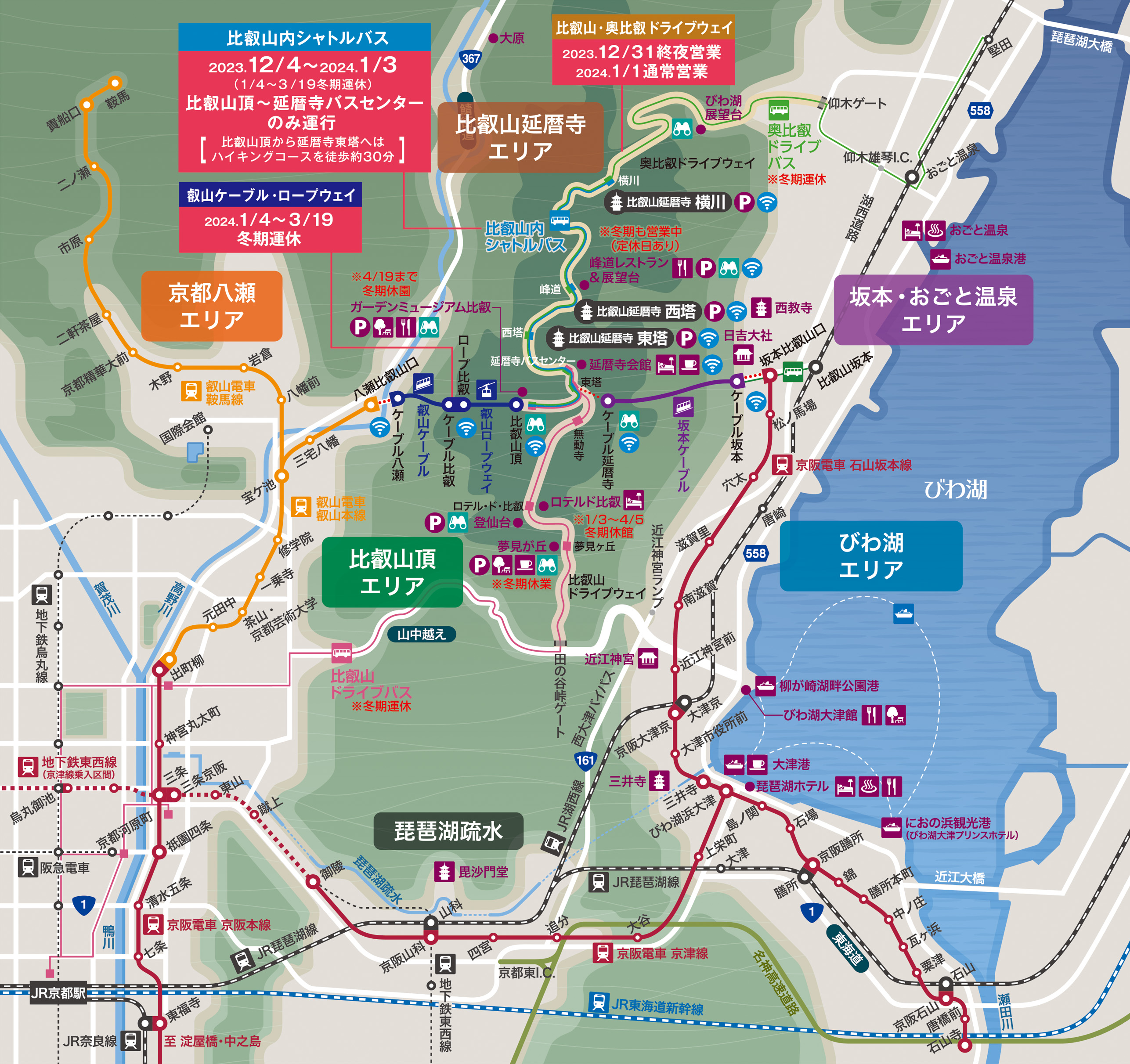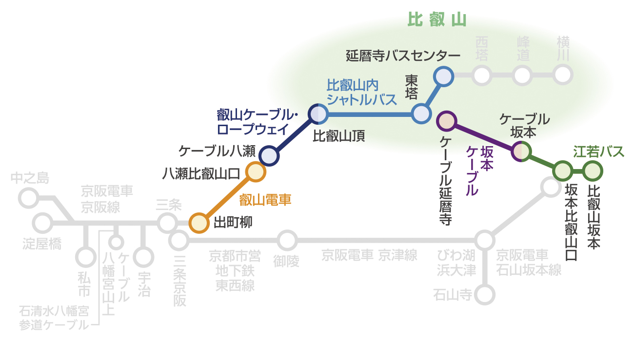 京都・出町柳、大津・坂本から比叡山への交通機関、比叡山内シャトルバスなど、6つの乗物が乗り降り自由!